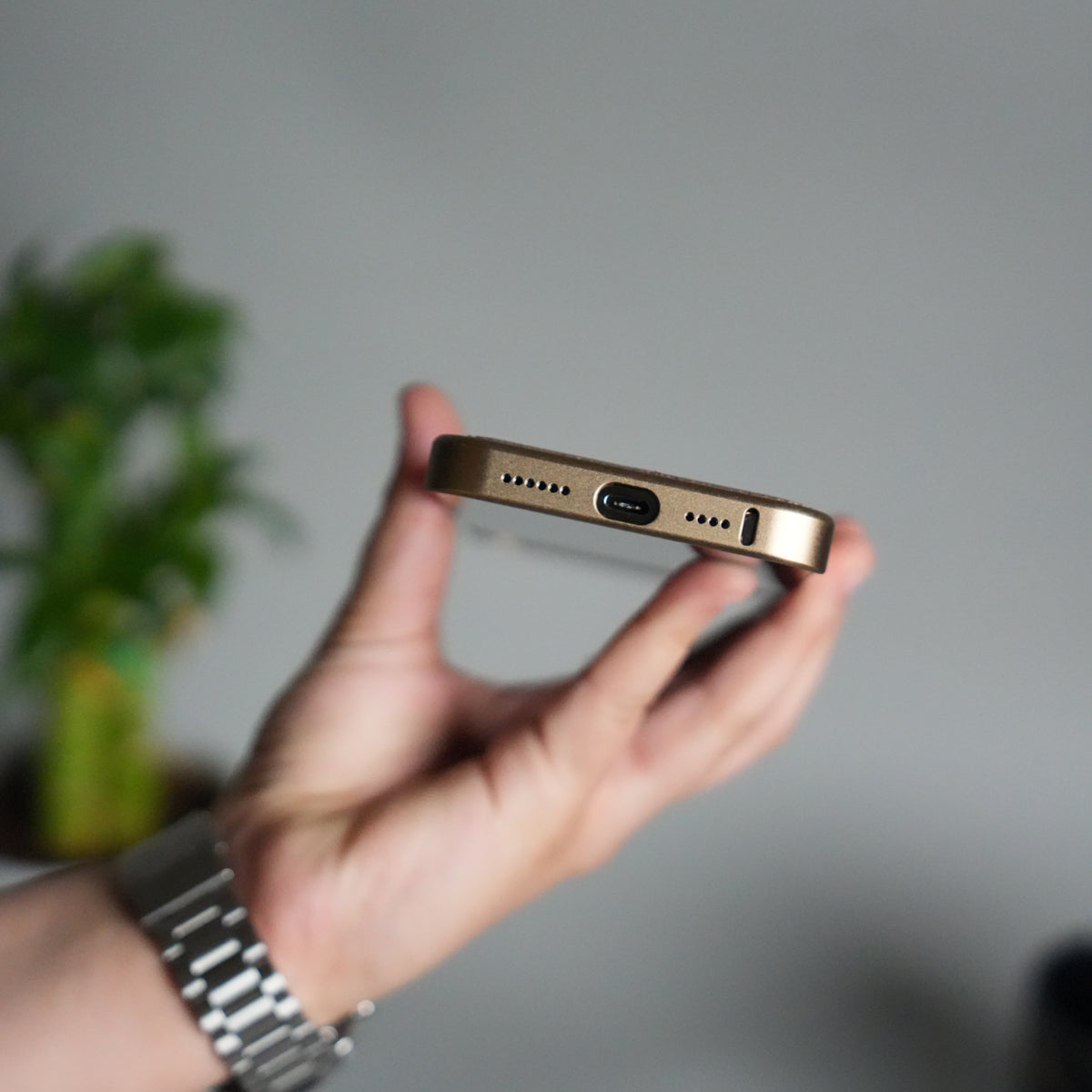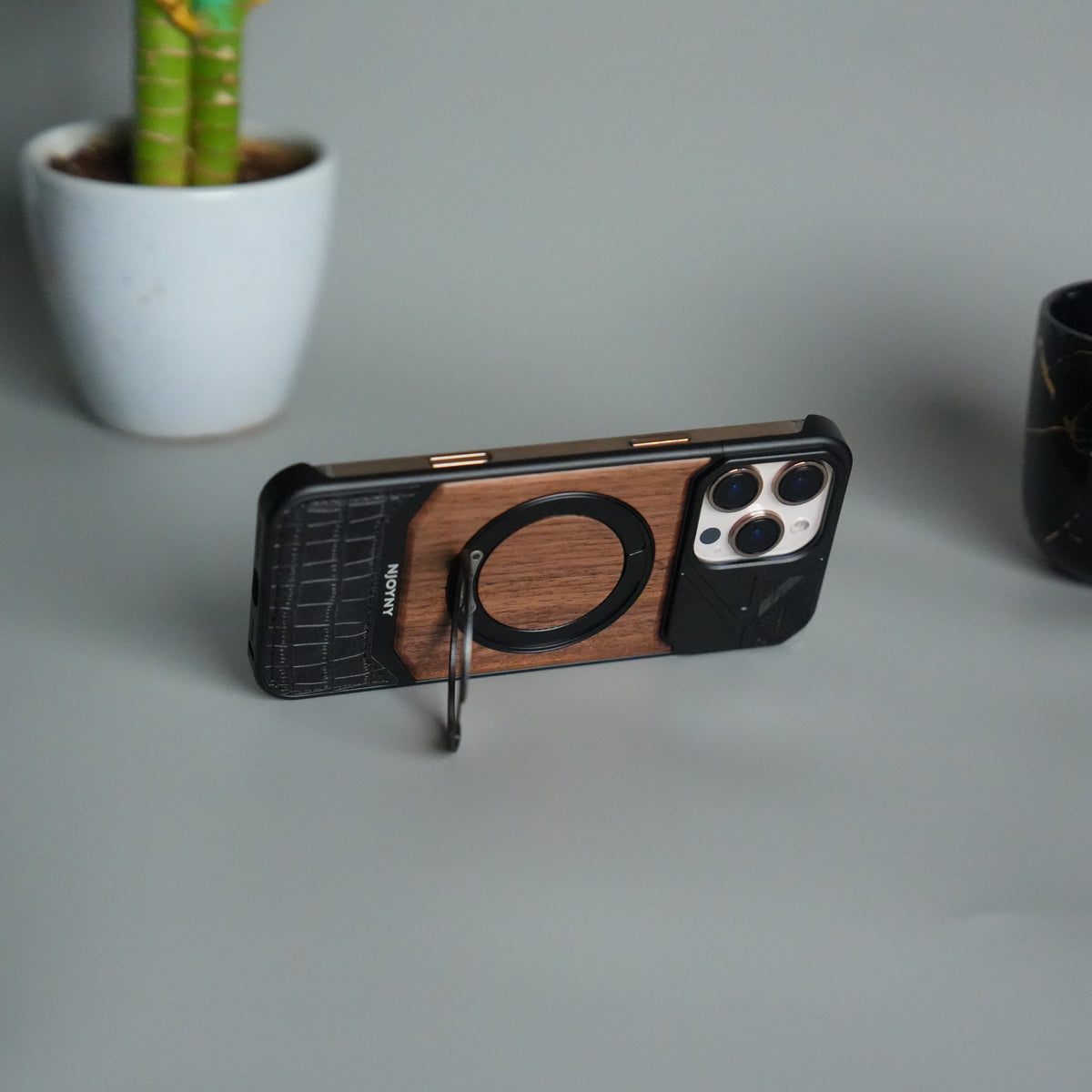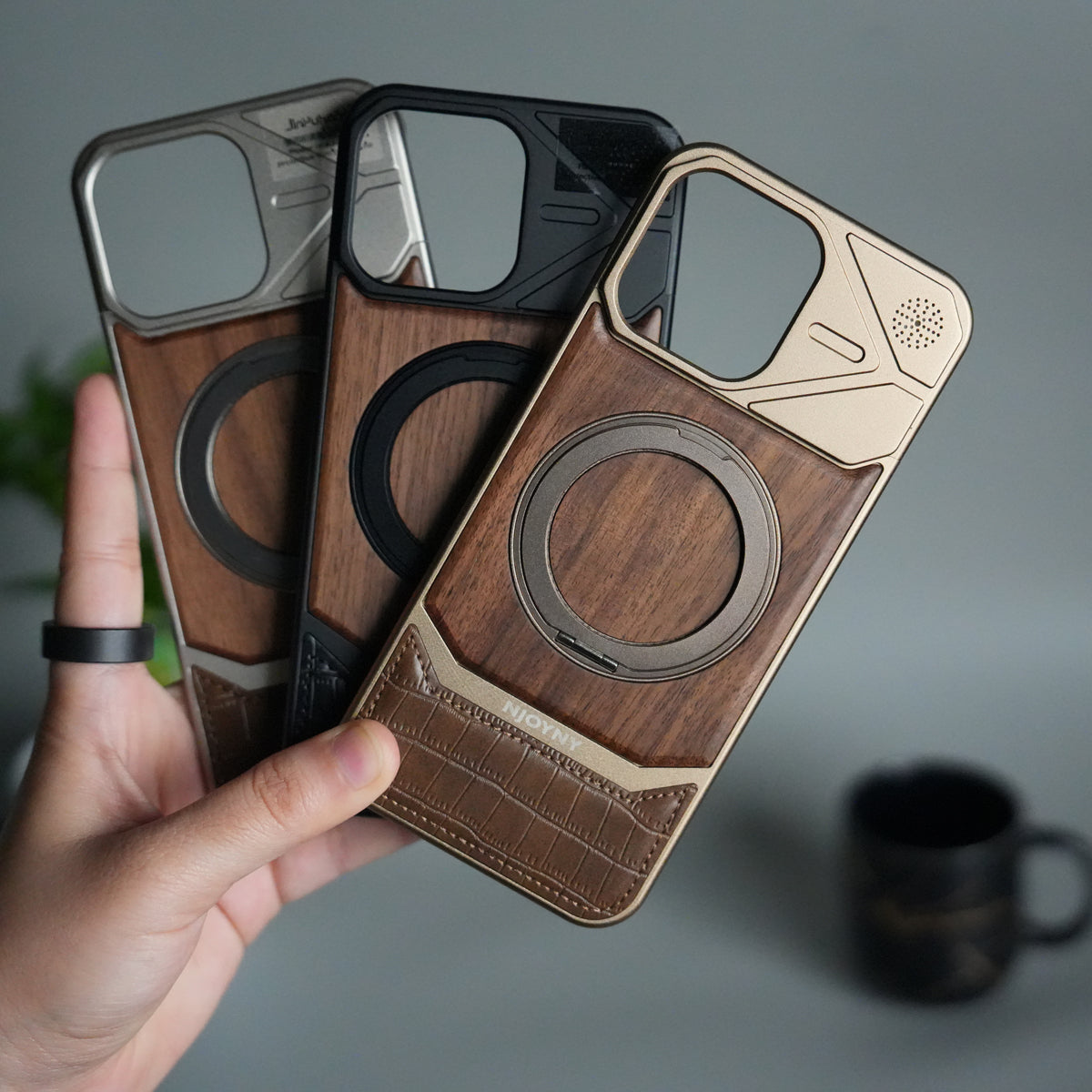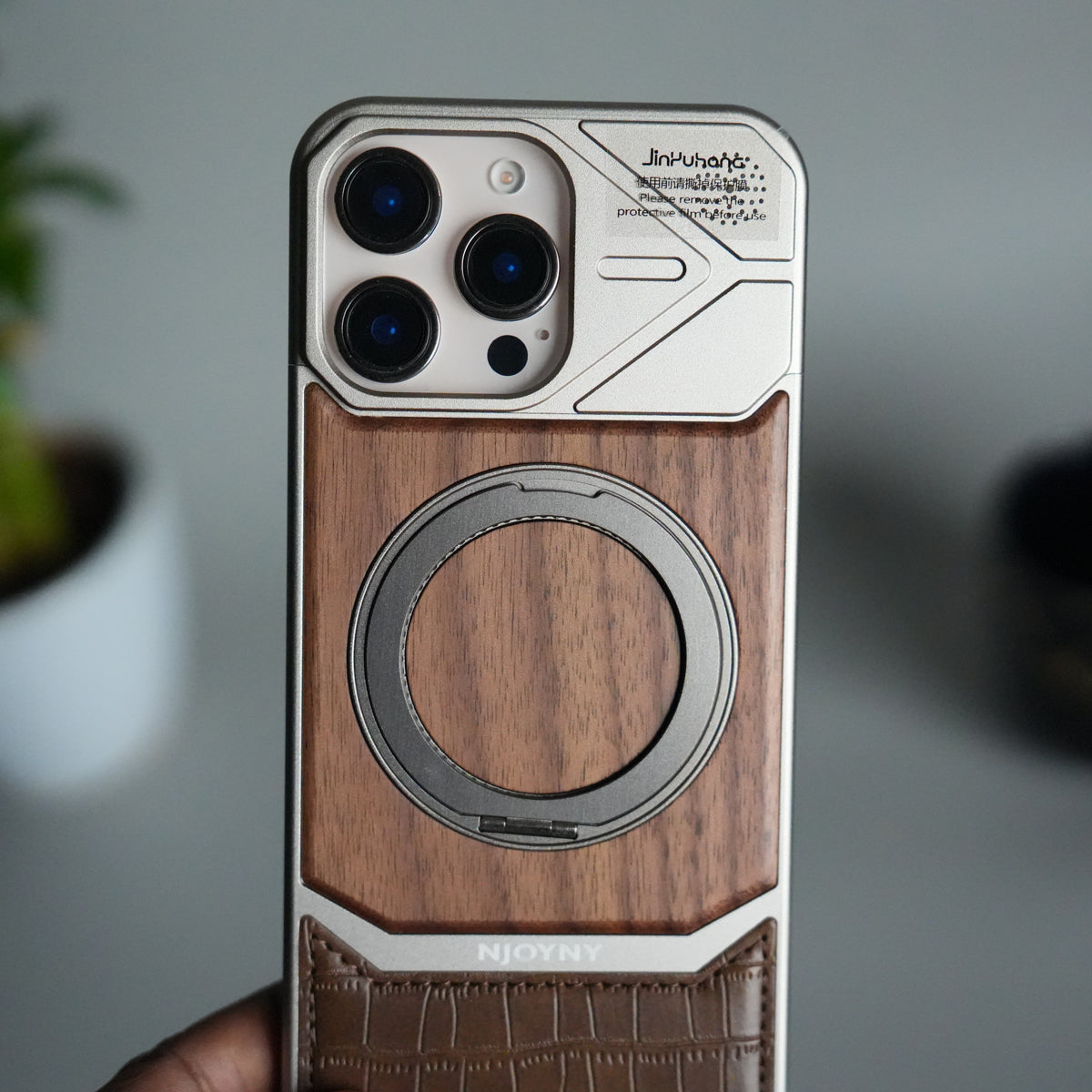iPhone 16 Series Metallic Wood Leather AeroFLex Aluminium Case With Rotating Stand