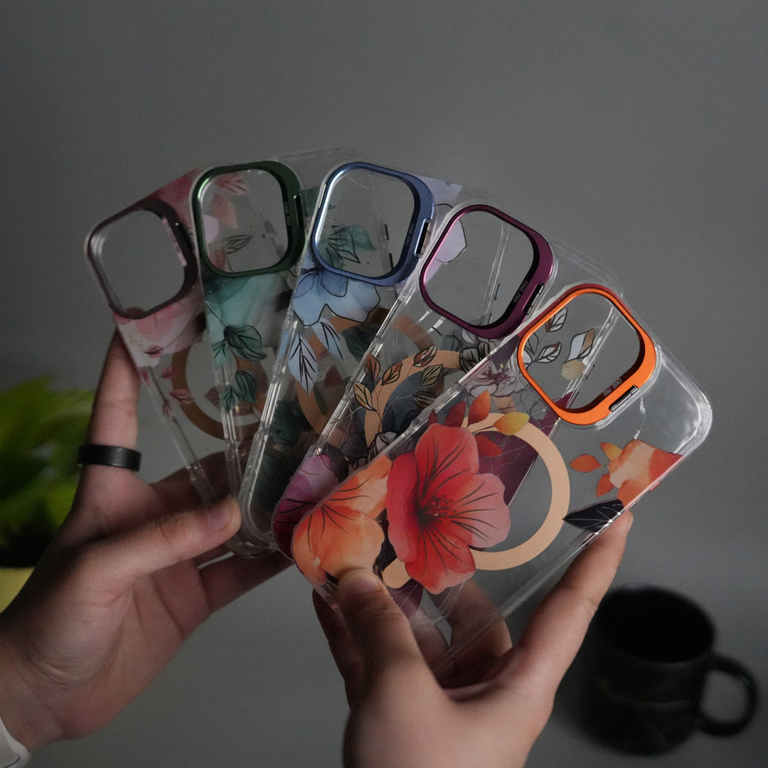 iPhone 17 FloraCrystal Clear Floral Design Case with Color Metal Camera Stand Frame