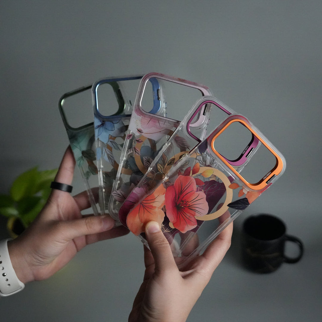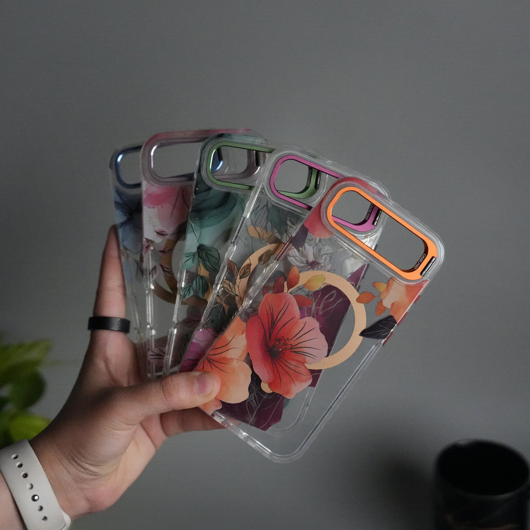 iPhone 17 Air FloraCrystal Clear Floral Design Case with Color Metal Camera Stand Frame
