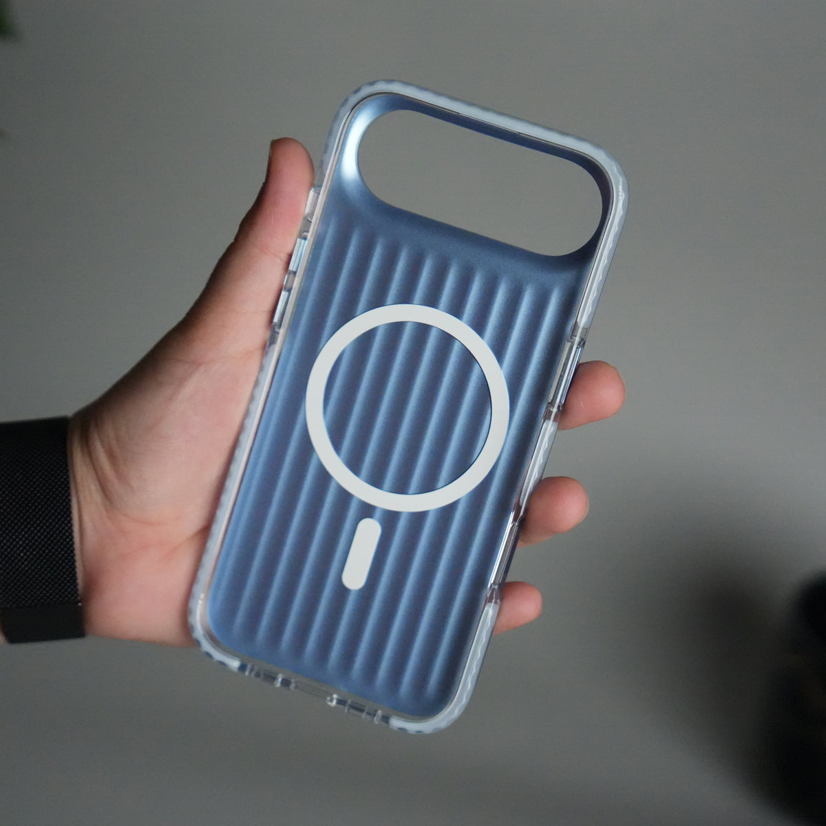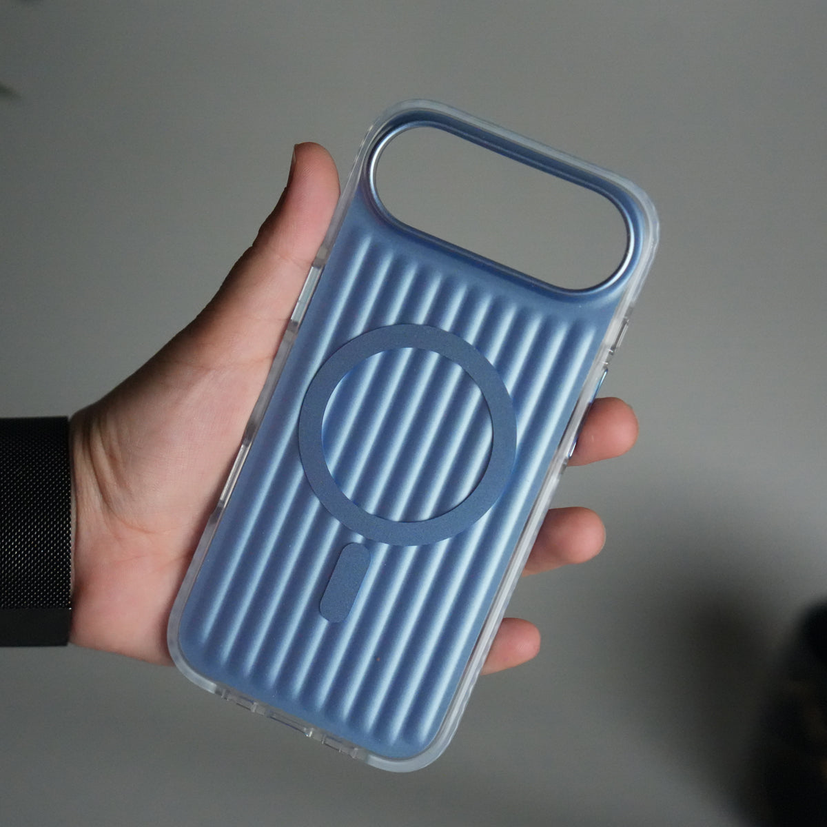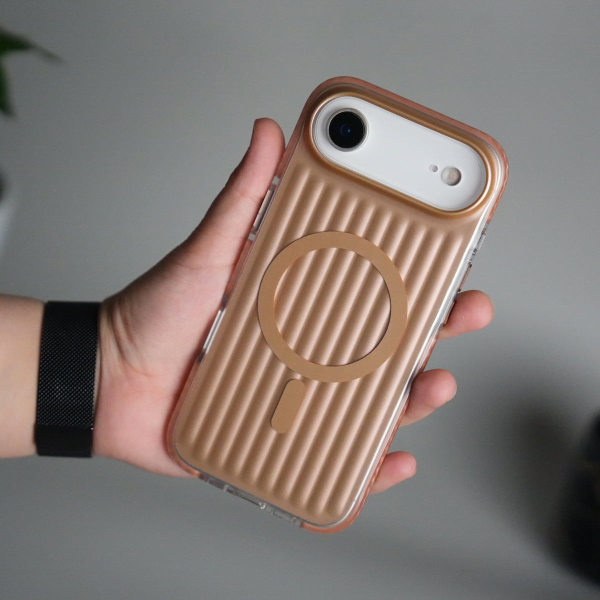 Add a touch of luxury and protection to your iPhone 17 Air with this suitcase-inspired ribbed case. Designed with MagSafe compatibility, it ensures fast wireless charging and secure magnetic attachment for accessories. The slim yet durable build offers scratch and drop protection, while the stylish ribbed finish gives your phone a modern, premium look. Available in Silver, Black, Pink, Dark Blue, Blue and Desert Gold to match your style.