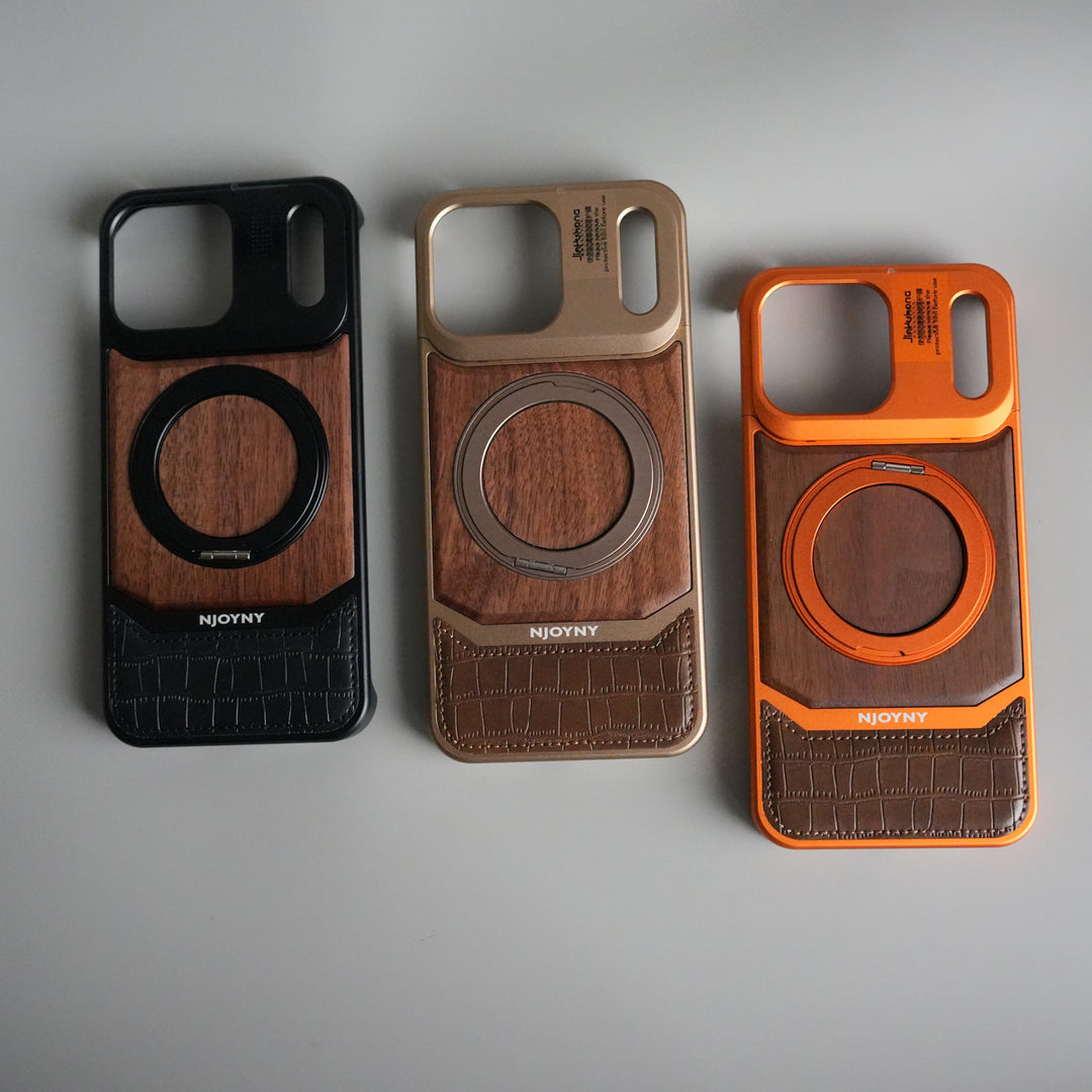 iPhone 17 Series Metallic Wood Leather AeroFLex Aluminium Case With Rotating Stand