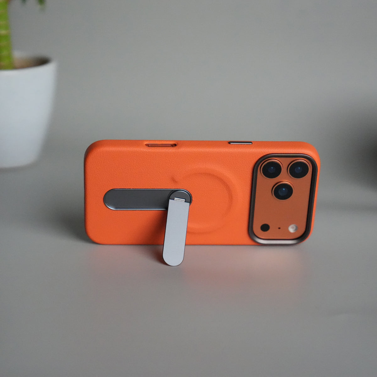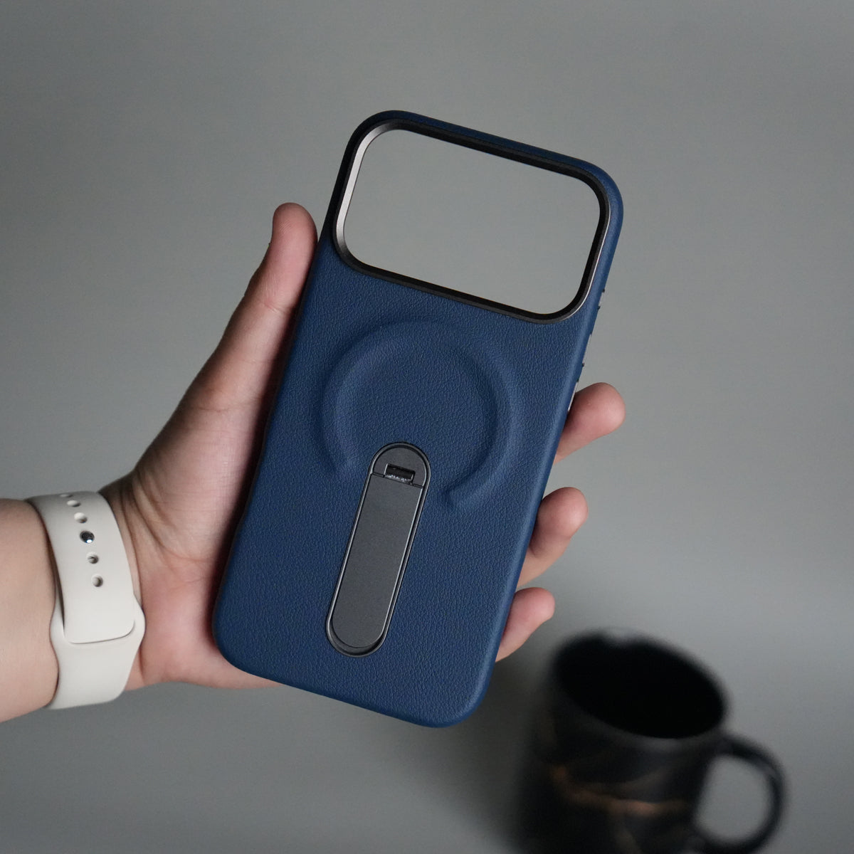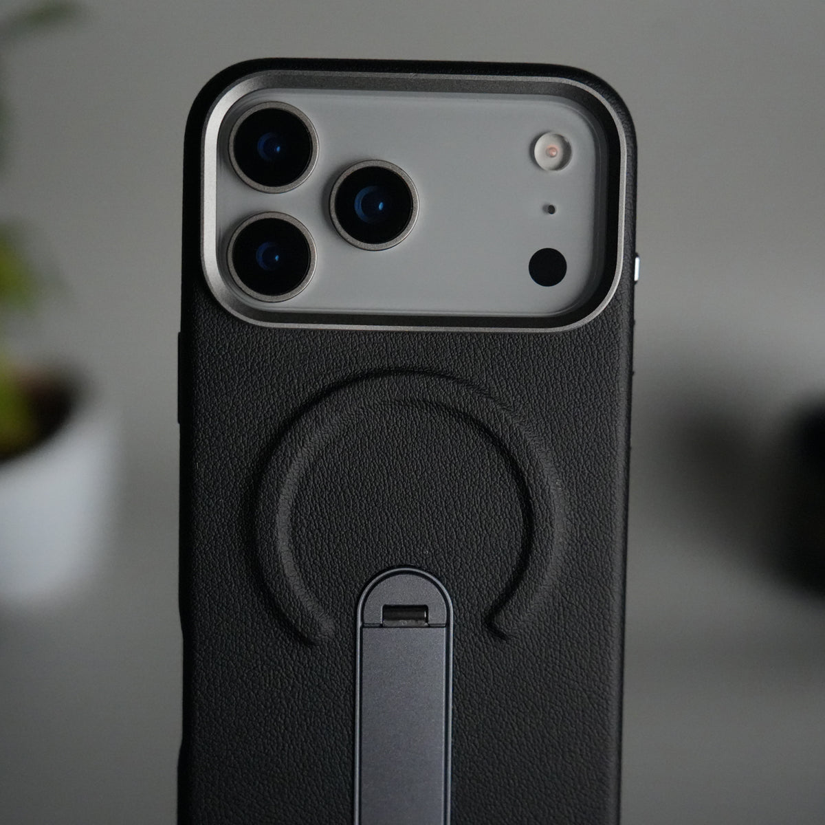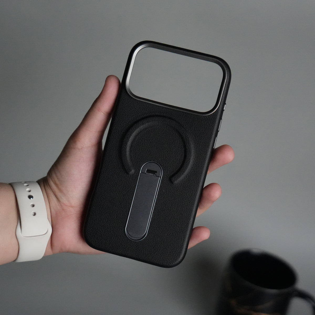 iPhone 17 Pro max Premium Leather-Texture Back Case with Metal Kickstand