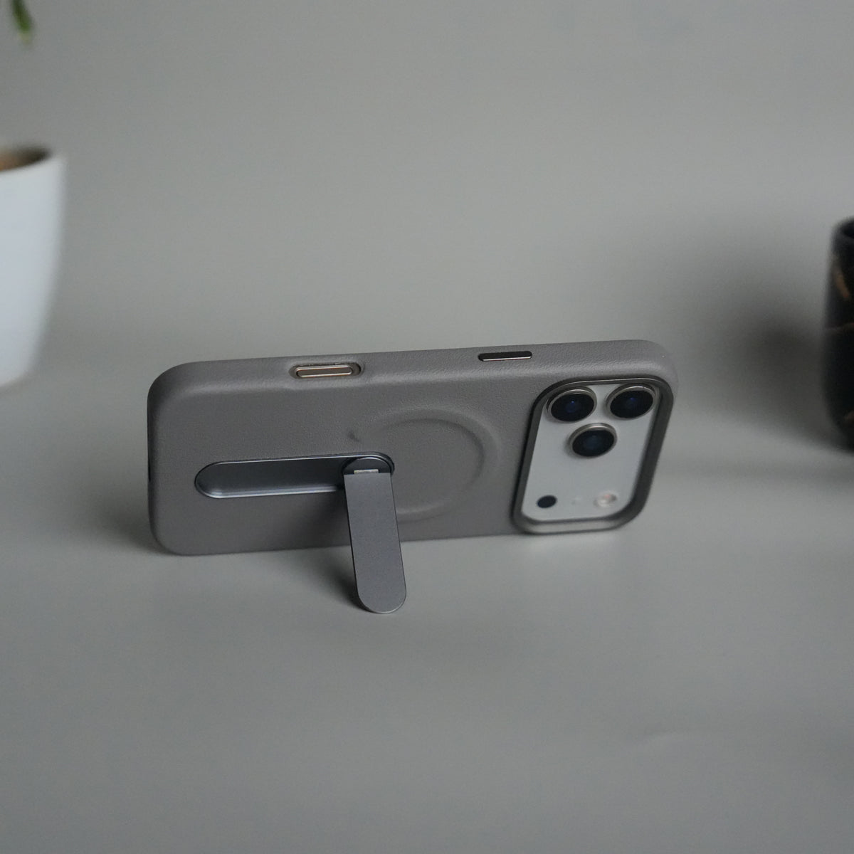 The case features a sleek built-in kickstand, perfectly integrated into the design for a clean, minimal look while offering stable hands-free viewing.