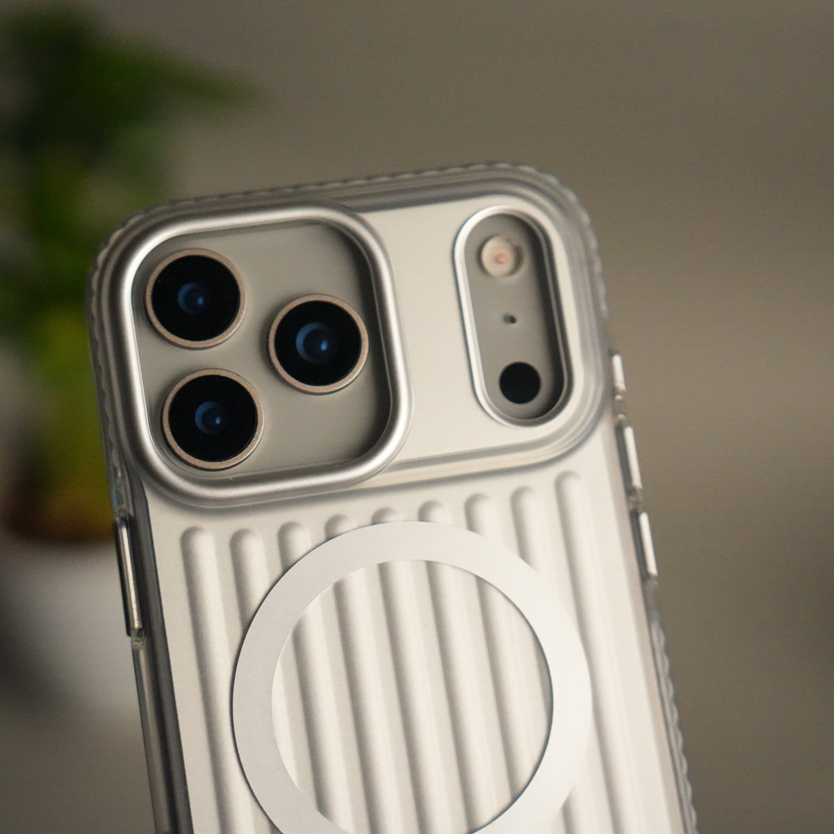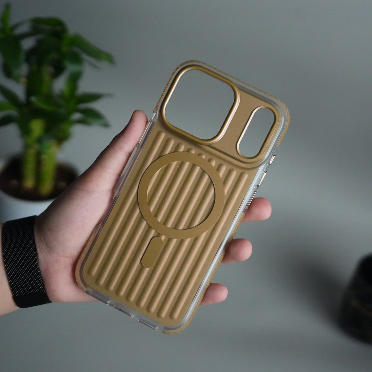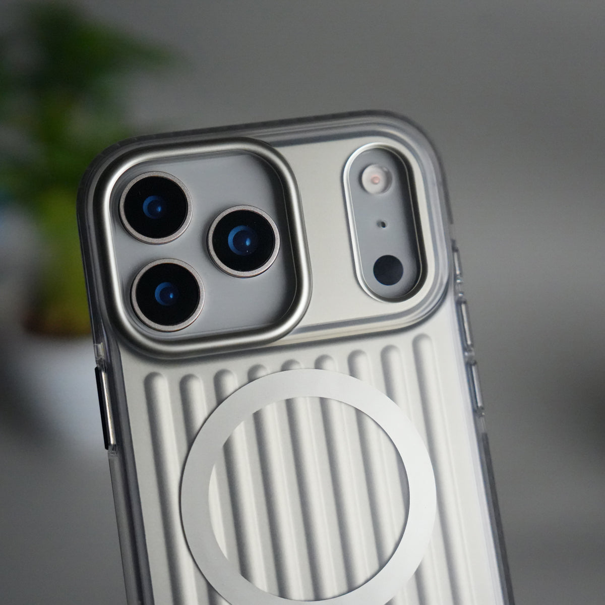 Add a touch of luxury and protection to your iPhone 17 Pro Max with this suitcase-inspired ribbed case. Designed with MagSafe compatibility, it ensures fast wireless charging and secure magnetic attachment for accessories. The slim yet durable build offers scratch and drop protection, while the stylish ribbed finish gives your phone a modern, premium look. Available in Silver, Black, Gray, and Desert Gold to match your style.