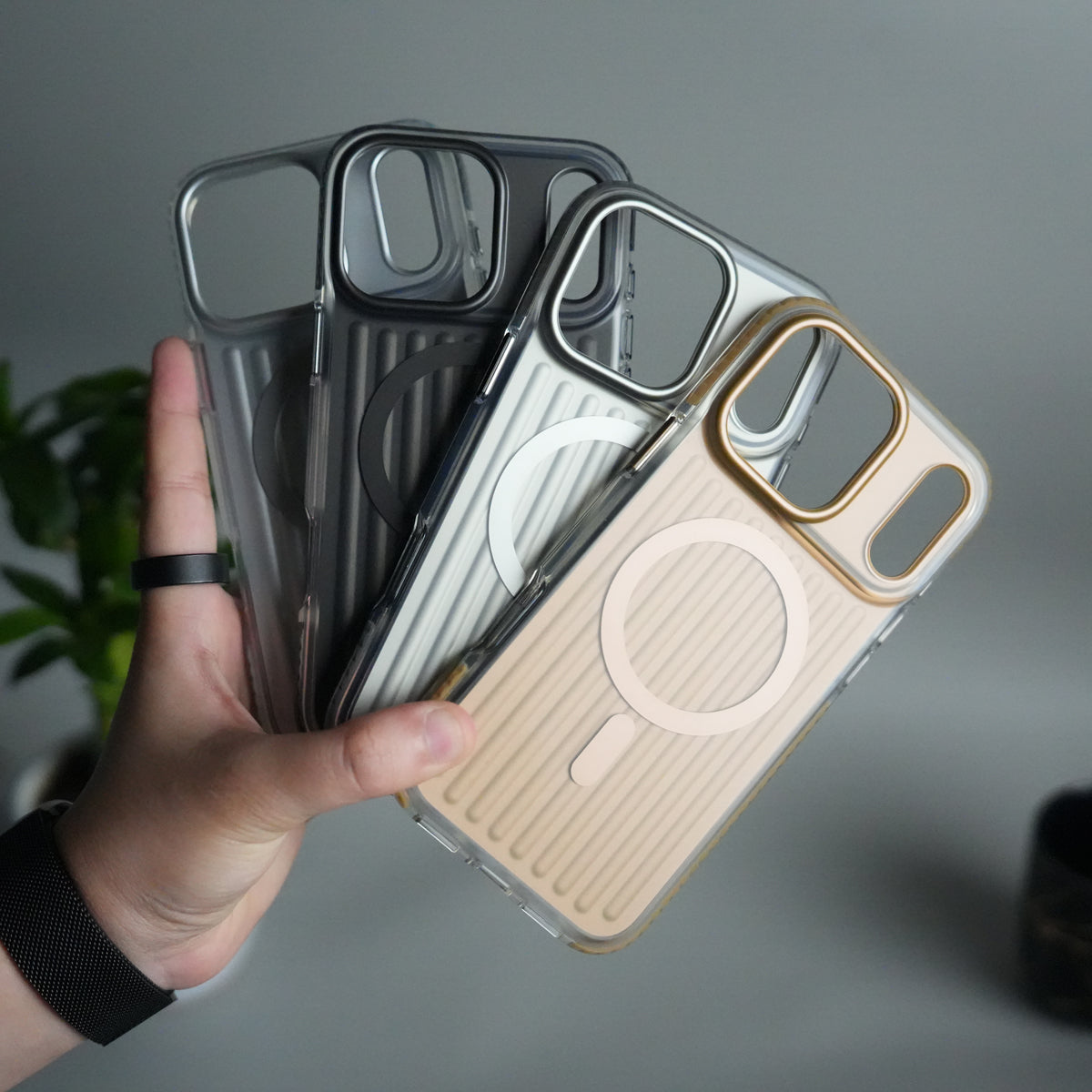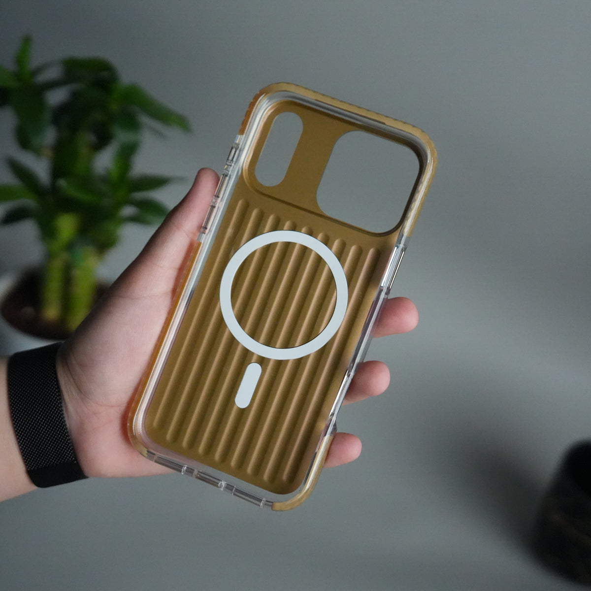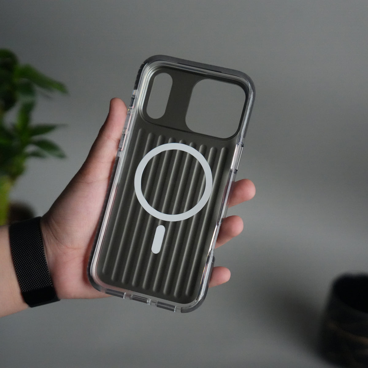 Add a touch of luxury and protection to your iPhone 17 Pro Max with this suitcase-inspired ribbed case. Designed with MagSafe compatibility, it ensures fast wireless charging and secure magnetic attachment for accessories. The slim yet durable build offers scratch and drop protection, while the stylish ribbed finish gives your phone a modern, premium look. Available in Silver, Black, Gray, and Desert Gold to match your style.