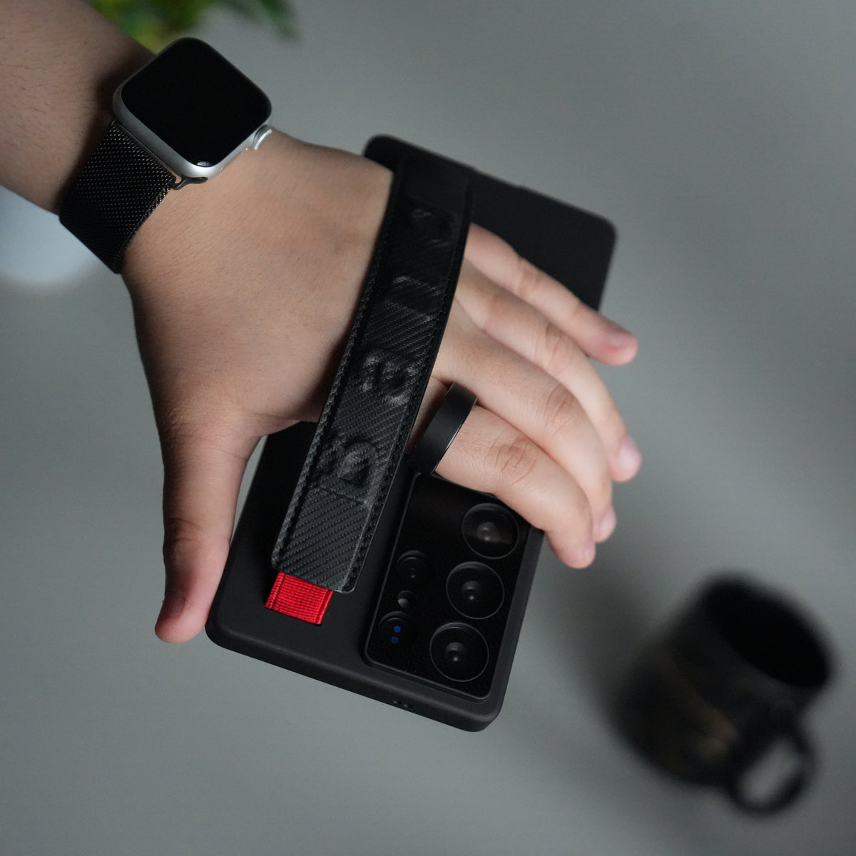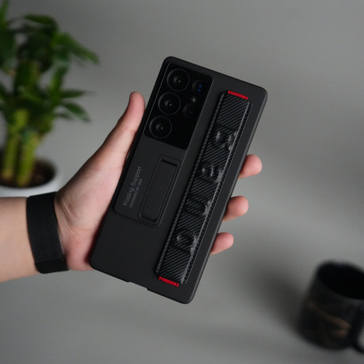 Get the perfect mix of style and functionality with this Galaxy S24 Ultra protective case. Designed with a premium band holder strap for a secure grip and one-hand use, plus a foldable kickstand for hands-free viewing, this case is built for convenience. The sleek finish with metallic accents adds a modern luxury touch while ensuring shockproof protection against drops and scratches.