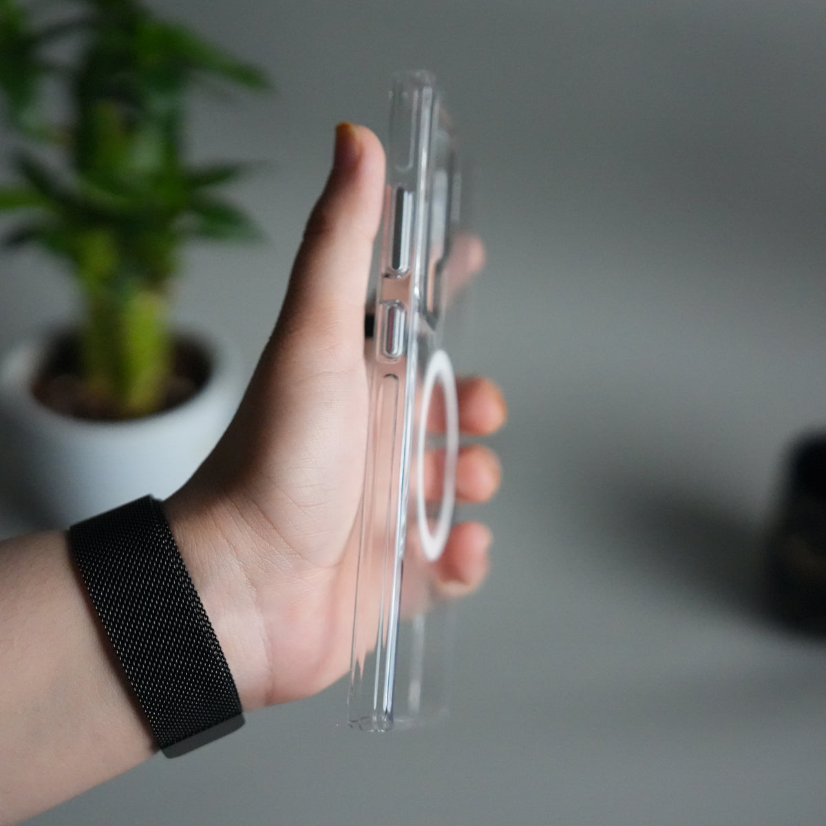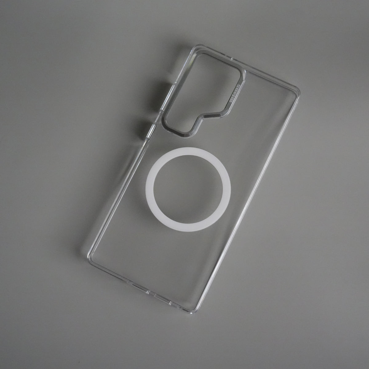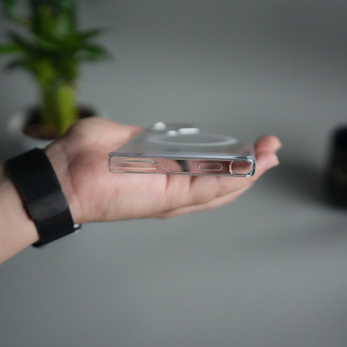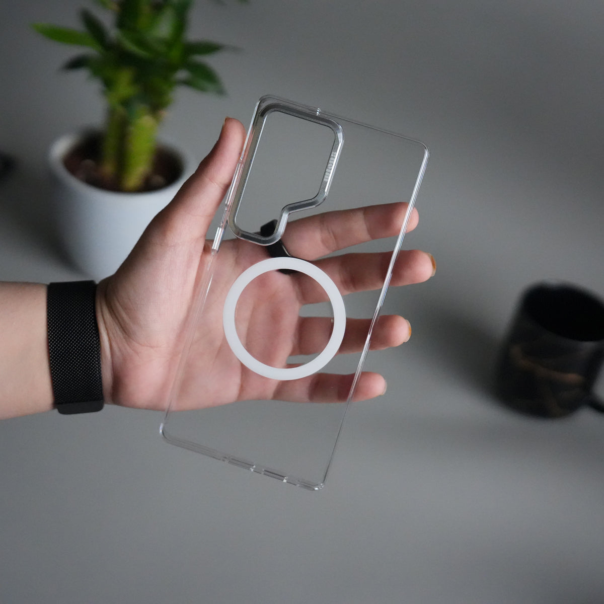 Show off the true beauty of your Samsung Galaxy S24 Ultra with this crystal clear shell case featuring a premium metal camera ring for added protection. The transparent design keeps your phone looking sleek, while the reinforced edges and scratch-resistant back provide everyday durability. Its slim-fit profile ensures comfort in hand and supports wireless & MagSafe charging without removing the case. Perfect for those who want style, clarity, and protection in one.