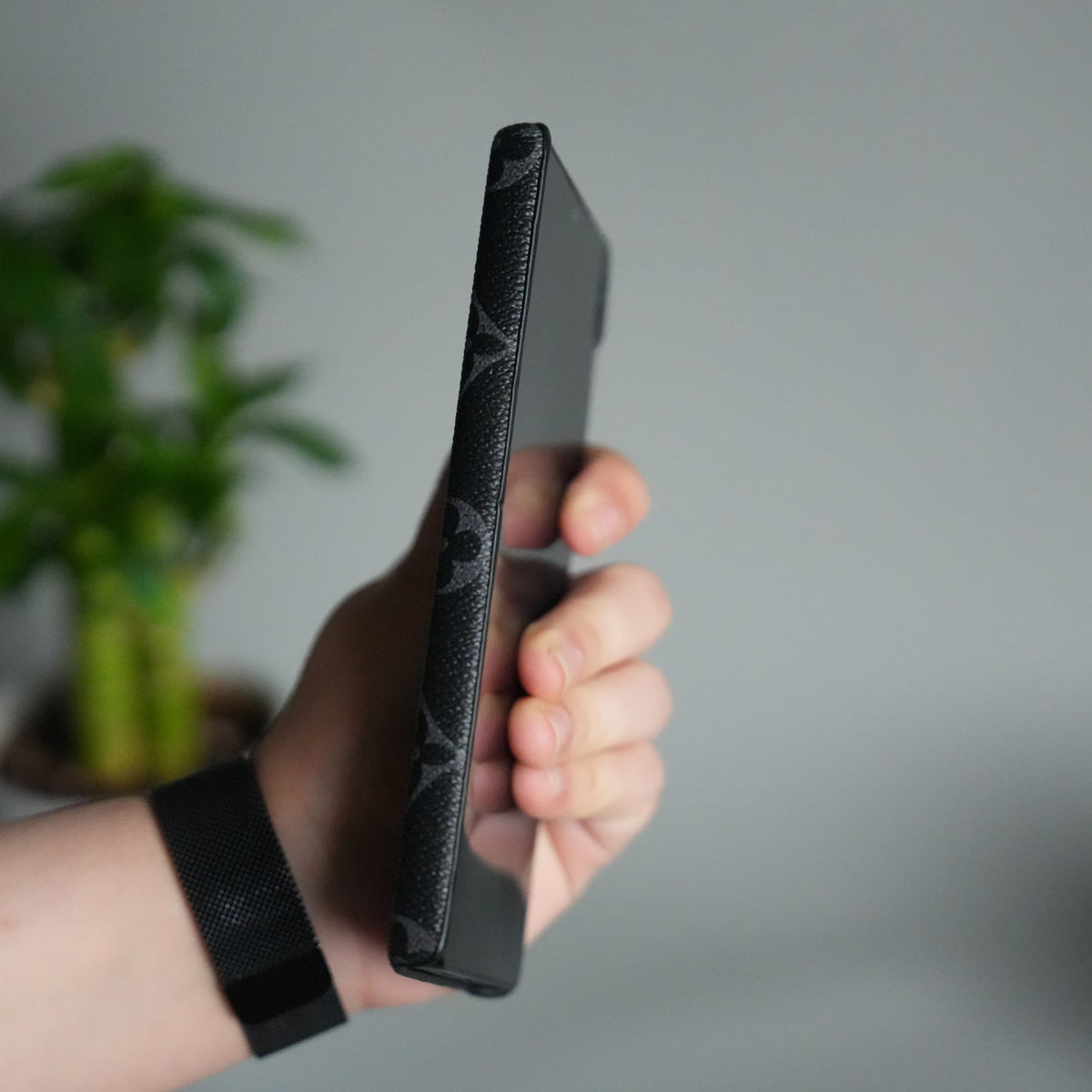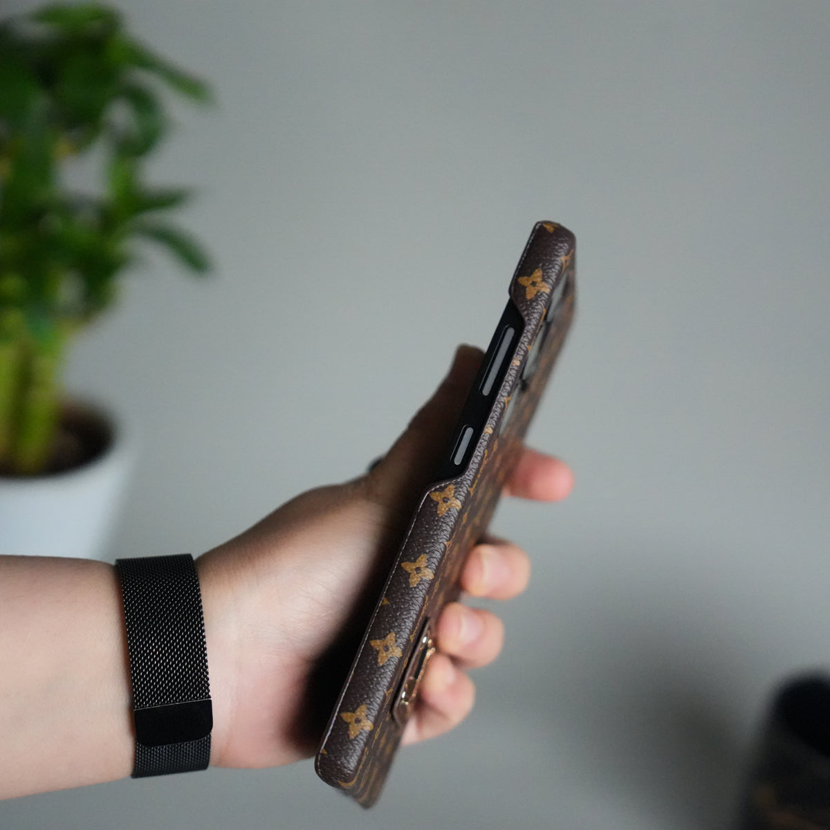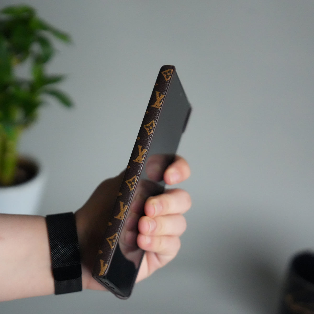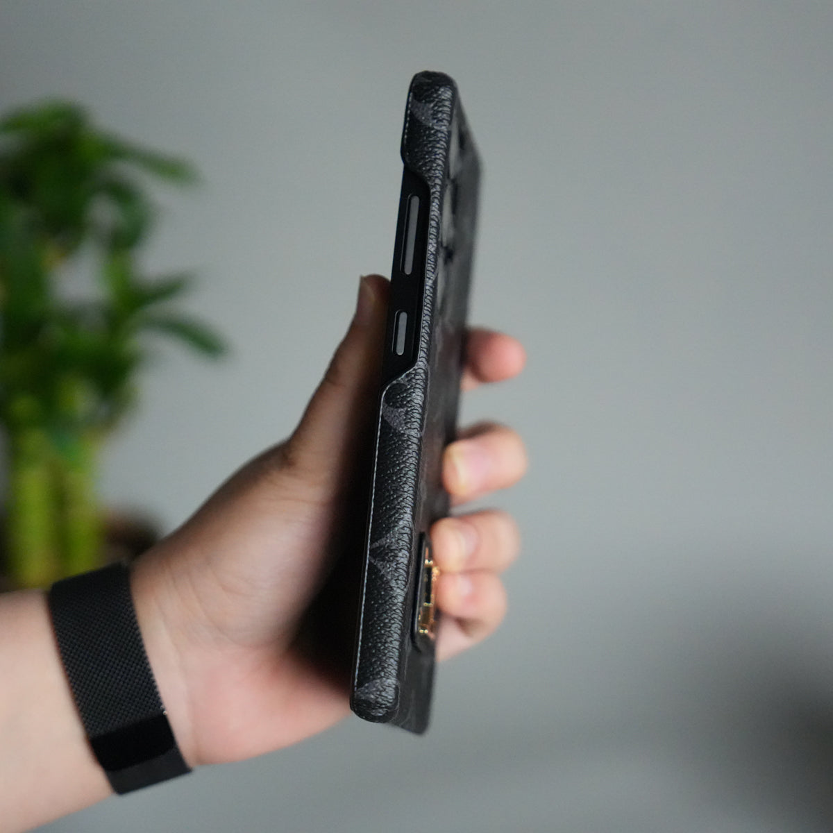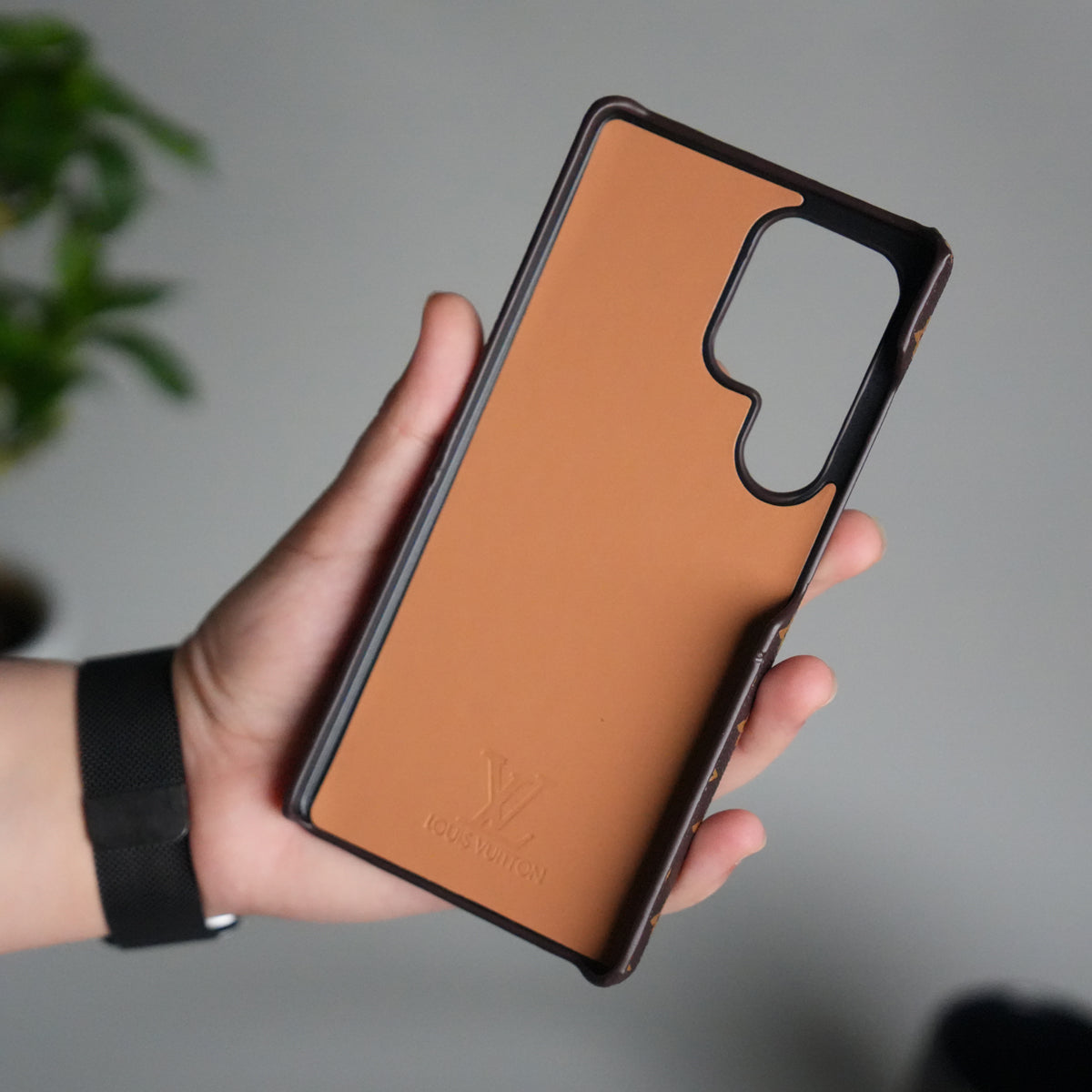 Upgrade your Galaxy S25 Ultra with this luxury leather-pattern case, inspired by classic designer textures. Crafted from durable hard material with a soft leather touch, it provides a premium feel and solid protection. The gold metal logo plate adds a bold, elegant accent that makes your phone stand out in style.