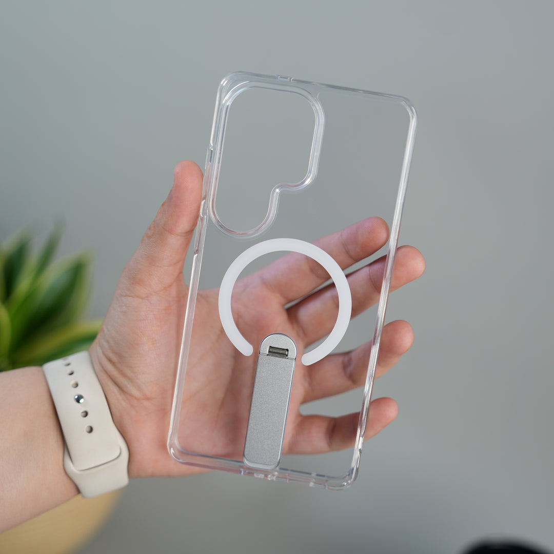 Galaxy S26 Ultra Transparent MagSafe Cover With Metal Camera Bump Kick Stand (White)